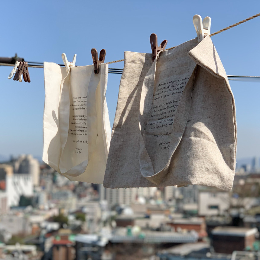 한쪽면은 Butterfly 곡 제목이, 한쪽면은 영문 가사가 프린트 되어 있으며, 소재에 린넨이 들어가 내추럴하면서도 고급스럽답니다.