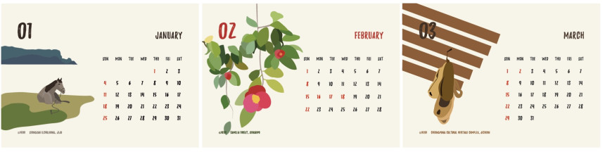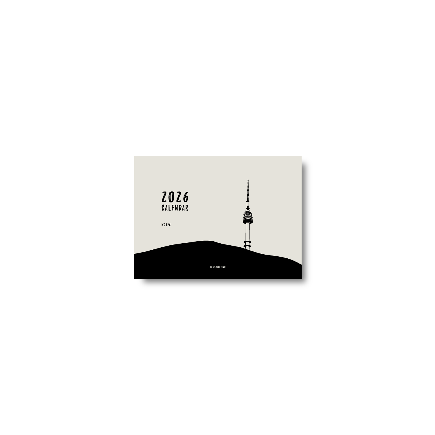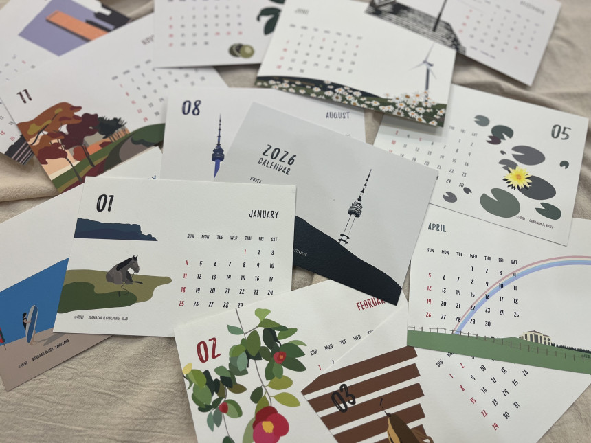 탁상형 달력에는 한국 여행지 일러스트를 배경없이 모티브들만 깔끔하게 담아 가독성과 활용도를 높였습니다.