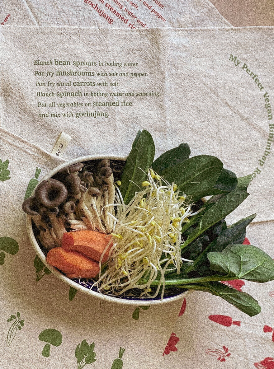 비건 비빔밥 레시피의 주재료가 된 콩나물, 당근, 버섯, 시금치의 간단한 레시피를 담은 귀여운 미니 레시피북입니다.