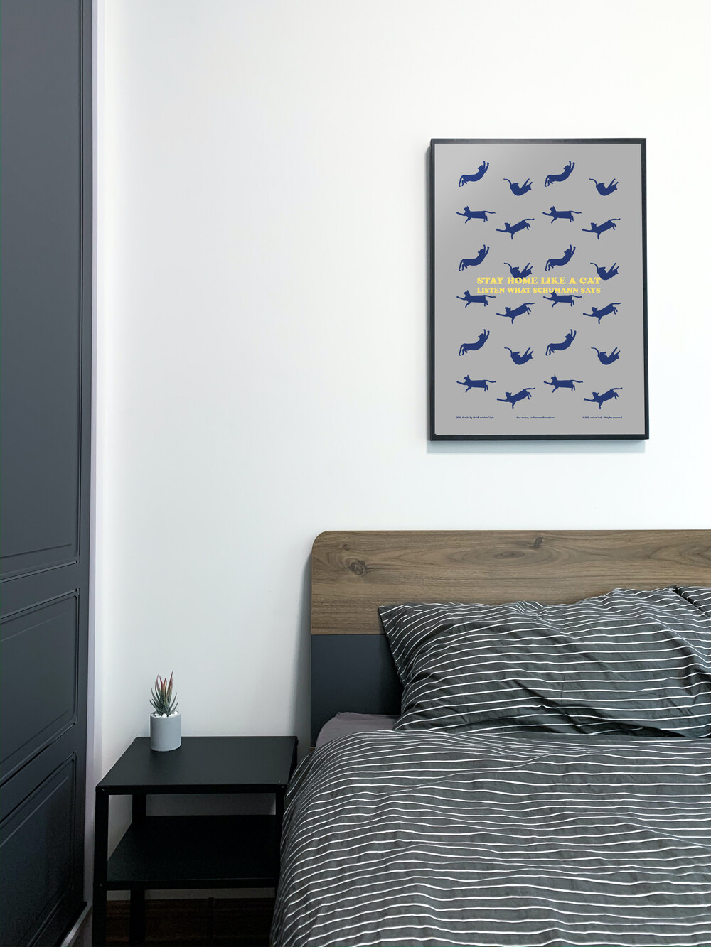 "Stay home like a cat, listen what schumann says."문구와 슈만이의 다양한 포즈로 이루어진 패턴 포스터입니다.